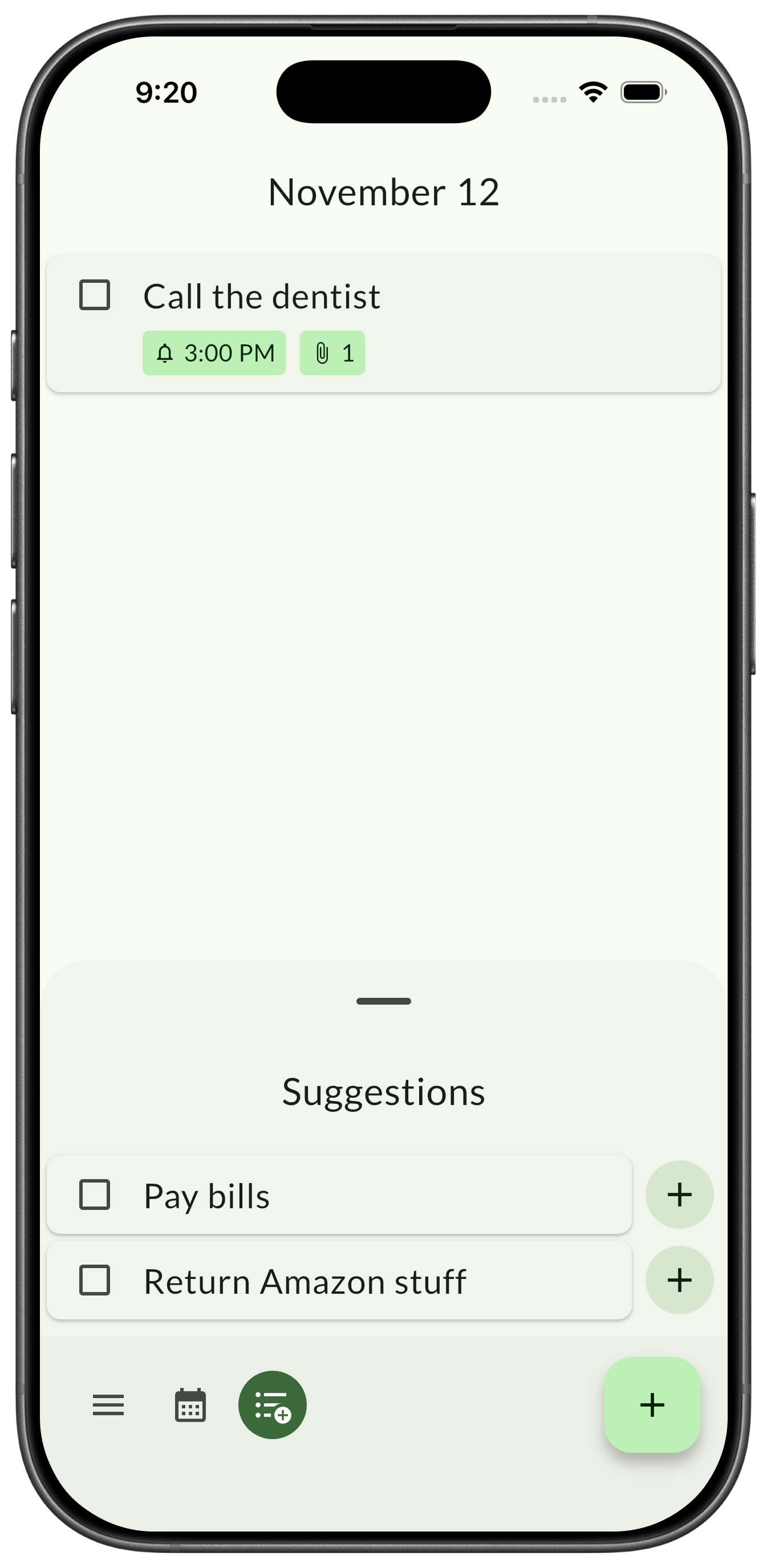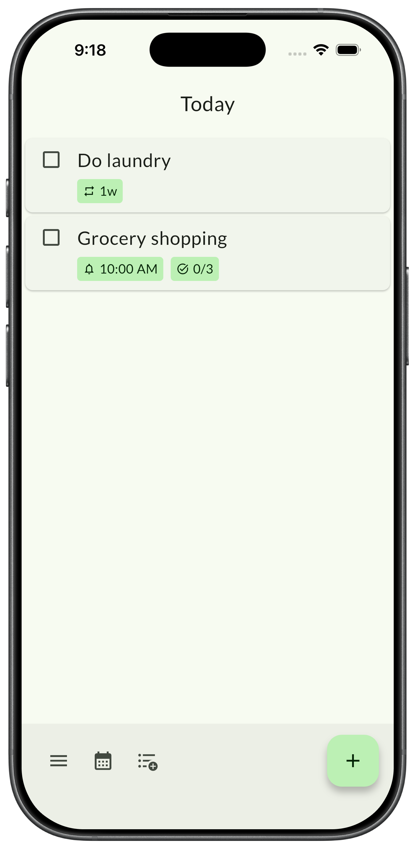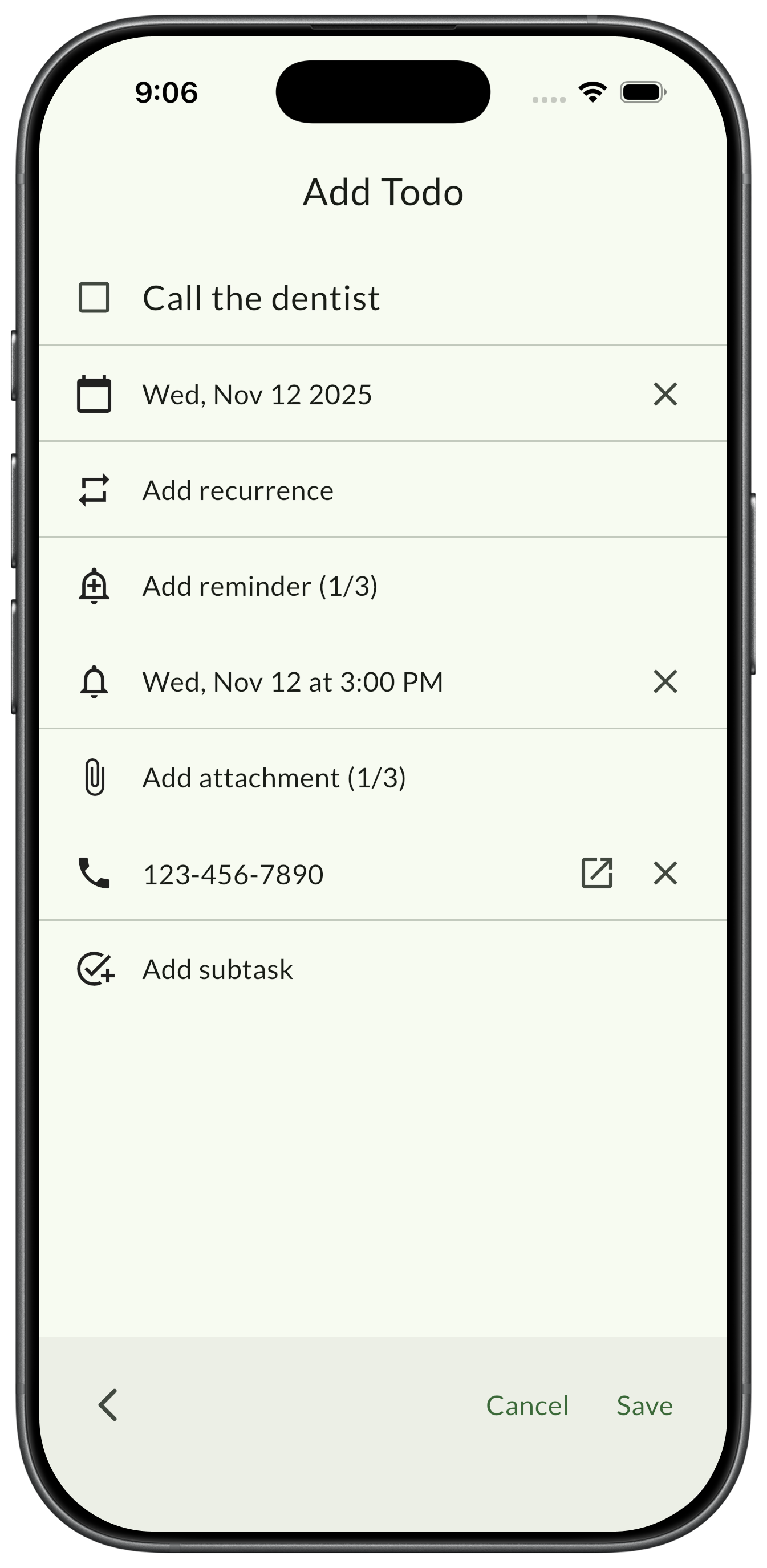 Todos can be scheduled and augmented with recurrences, reminders, subtasks, and attachments (including phone numbers, addresses, and web links). Plus, you can launch the appropriate app for attachments directly from the edit screen.